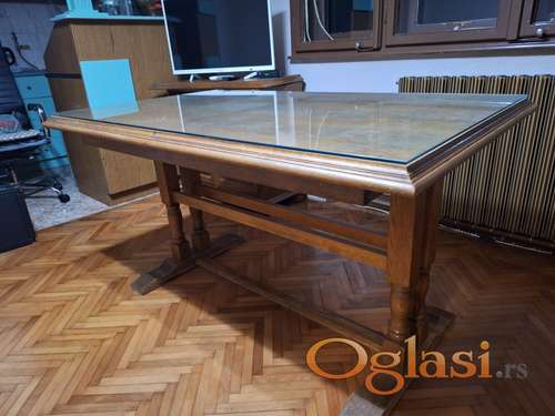 Tekst oglasa: <p><strong>Opis oglasa</strong></p> <ul><li>Sto je izradjen takodje od drveta i furnira. (<strong>staklo gratis</strong>)</li> <li>Dimenzije: (Širina x Dubina x Visina) u cm: 140 x 86 x 78</li> <li>Mogućnost proširivanja + 40 cm</li> <li>Licno preuzimanje i transport u vasoj organizaciji</li> </ul> |