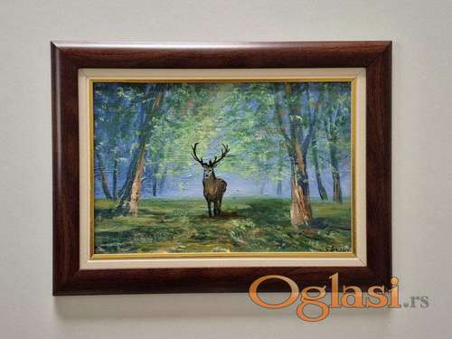 Tekst oglasa: <p>Ulje na slikarskoj lepenici Jelen u sumi, prelepo umetnicko delo. Slika je uramljna u jako lep ram, dimenzije slike sa ramom 43 x 33. Privatna kolekcija.</p> |