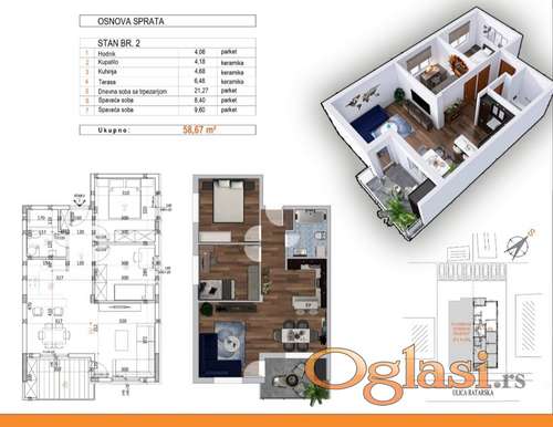 Tekst oglasa: <p>Prodaje se nov trosoban uknjižen stan na Adicama u mirnom kraju punom zelenila, blizu Dunava. Stan se nalazi na prvom spratu i sastoji se od dnevnog boravka, spavaće sobe, odvojene kuhinje, kupatila, hodnika i prelepe terase. Grejanje na gas sa kalorimetrima, placa se samo realna potrosnja u toku grejne sezone. Useljiv u decembru 2026. </p> |