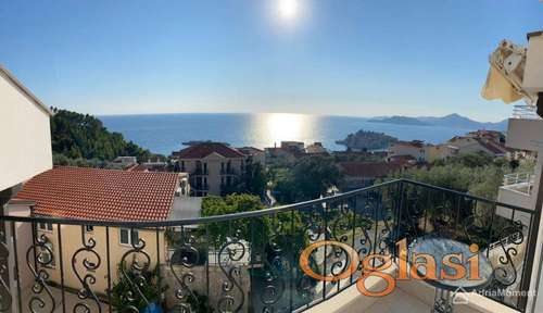 Tekst oglasa: Penthouse s 4 spavaće sobe na Svetom Stefanu s panoramskim pogledom na more, planine i ostrvo. Prostran, svijetao stan. Sunčana strana. Zauzima cijeli sprat troetazne zgrade. Površina stana prema listu nepokretnosti – 82 m2 Stan se sastoji od prostranog dnevnog boravka s kuhinjskim dijelom i terasom, 4 spavaće sobe, 2 kupaonice, hodnika. Izlazi na terasu iz dnevnog boravka i svih spavaćih soba. Stan se prodaje sa namjestajem i tehnikom. Napravljeni su popravci europske kvalitete, kupaonice imaju podno grijanje. Ugrađeni su samostojeći klima uređaji koji osiguravaju grijanje i hlađenje. Balkoni imaju kovane ograde. Udaljenost do mora je oko 10 minuta pješice. Oko zgrade nalazi se besplatan parking. Nekretnina je legalna, postoji građevinska i upotrebna dozvole. |