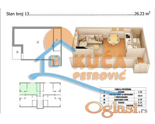 Tekst oglasa: Na prodaju garsonjera površine 26m², koji se nalazi na trećem spratu nove stambene zgrade u naselju Branko Bjegović.. Nekretnina se nalazi na mirnoj lokaciji, u neposrednoj blizini osnovne škole, vrtića ambulante i gradskog prevoza. Čine ga dnevna soba sa kuhinjom i trpezarijom, kupatilo i terasa. Poseduje PVC stolariju, grejanje na struju, što omogućava niske troškove održavanja. Idealna je za jednu osobu, studenta ili kao investicija za izdavanje. Planirani završetak radova jun 2026 god. Moguća kupovina putem kredita. Ovo je samo deo naše ponude, za više informacija, stojimo Vam na raspolaganju. |