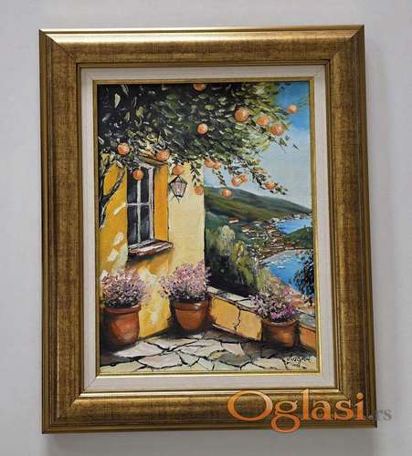Tekst oglasa: <p>Ulje na platnu Pod krosnjom pomorandzi, prelepo umetnicko delo. Slika je uramljena u jako lep ram, dimenzije slike sa ramom 56 x 46. Privatna kolekcija.</p> |