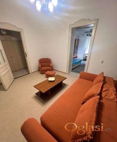 Tekst oglasa: <p>Izdaje se namešten stan salonac, u staroj zgradi na 1. spratu.<br /> Stan ima terasu sa dva ulaza, dnevni boravak, zasebnu kuhinju, hodnik, kupatilo i dve velike sobe.<br /> Idealno za studente, zbog blizine fakulteta. <br /> Parking javni ispred zgrade i u dvorištu.<br /> Bez kućnih ljubimaca.<br /> Useljiv odmah.<br /> Depozit u visini jedne mesečne zakupnine, a agencijska provizija u visini pola mesečne zakupnine.</p> |