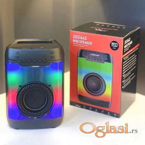 Tekst oglasa: <p>Zvucnik Bluetooth ZQS 1443</p> <p><br /> TEHNIČKE SPECIFIKACIJE</p> <p>MODEL : ZQS-1443</p> <p>– Bluetooth bežična veza</p> <p>– FM radio: 87 Mhz – 108 Mhz</p> <p>– Izlazna snaga: 8W</p> <p>– Dugme ON/OFF</p> <p>– Led zvučnik RGB boja</p> <p>– Kontrola jačine zvuka</p> <p>– Ulaz za mikrofon 6,5 mm</p> <p>– Ugrađena baterija 3.7v 1200 mAh</p> <p>– DC: 5V microUSB</p> <p>– MP3 reprodukcija sa USB kartice</p> <p>- Punjiva baterija</p> <p>– Dimenzije (D*Š*V): 22/14/13 cm</p> <p>---------------------------------Ukoliko zelite da porucite-------------------<br /> Posaljite poruku preko SMS PORUKE, VIBER<br /> 1 Ime i prezime<br /> 2 Ulica i broj<br /> 3 Mesto i postanski broj<br /> 4 Broj telefona za kontakt</p> |