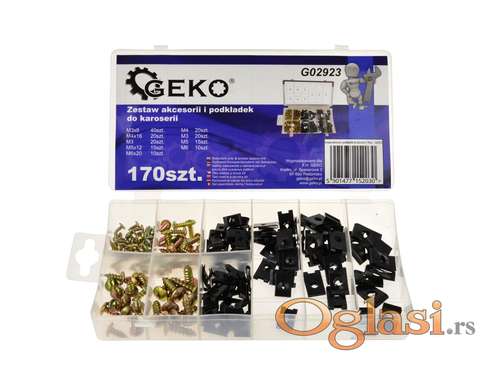 Tekst oglasa: <p>Set dodataka za karoseriju i perilice 170 kom<br /><br /> Set vijaka i podmetača za telo.<br /><br /> Uključeni su šrafovi i podloške M3, M4, M5, M6.<br /><br /> Sadržaj paketa<br /><br /> 40 x M3 x 8mm šraf<br /><br /> 20 x M4 x 16mm šraf<br /><br /> 15 x M5 x 12mm šraf<br /><br /> 10 x M6 x 20mm šraf<br /><br /> 20 x M3 podloška 14 x 8 mm<br /><br /> 20 x M3 podloška 18 x 11 mm<br /><br /> 20 x M4 podloška 16 x 11 mm<br /><br /> 20 x M5 podloška 20 x 12.5 mm<br /><br /> 20 x M6 podloška 22 x 12.5 mm<br /><br /><br /> Proizvod: Poljska<br /><br /> Ukoliko zelite da porucite, posaljite poruku preko SMS PORUKE ili VIBERA<br /> 1. Ime i prezime<br /> 2. Ulica i broj<br /> 3. Postanski broj mesto<br /> 4. Kontakt telefon<br /><br /> Ili pozovite na broj telefona<br /> 061/191-4635</p> |