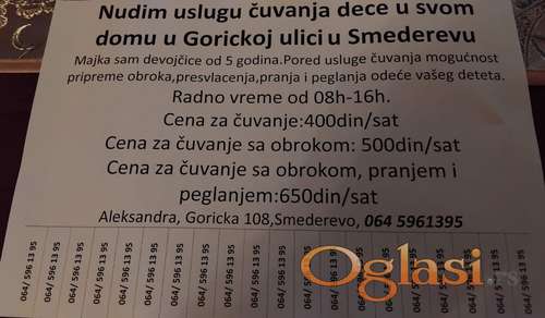 Tekst oglasa: <p>Nudim uslugu čuvanja dece u svom domu u Gorickoj ulici u Smederevu.Majka sam devojčice od 5 godina.Pored usluge čuvanja mogućnost pripreme obroka,presvlacenja,pranja i peglanja odeće vašeg deteta. Radno vreme od 08h-16h.</p> <p>Aleksandra, 064 5961395 </p> <p>Cena po satu za čuvanje:400din/sat</p> <p>Cena za čuvanje sa obrokom:500din/sat</p> <p>Cena za čuvanje sa obrokom, pranjem i peglanjem:650din/sat</p> |
