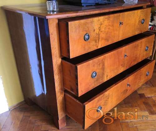 Tekst oglasa: <p>Prodajem stilsku komodu sa tri fioke.<br /> Profesionalno restaurirana pre osam godina (bajc, šelak politura).</p> <p>Prisutna manja oštećenja (potklobučen furnir na dva mesta) koja se relativno jednostavno mogu sanirati.</p> <p>Dimenzije (Š-V-D) su 130 x 90 x 58cm.<br /> Povod za prodaju je selidba.<br /> Komoda se nalazi u Novom Sadu, Liman 1.</p> |