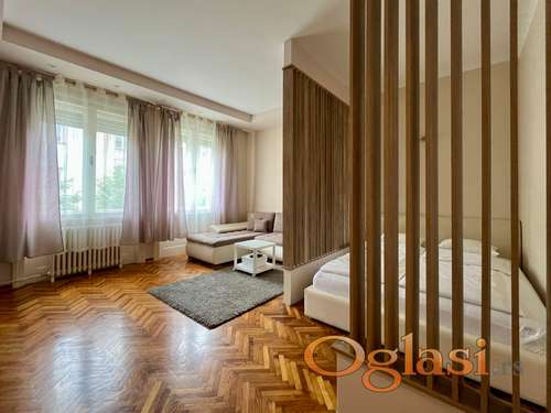 Tekst oglasa: <p>Stan u mirnoj ulici u strogom centru, površine 39 kvadrata, visoki salonski plafoni, prostrana svetla soba sa drvenim panelima odvojenim delom sa spavaćim krevetom, kuhinja (trenutno bez rerne i sudomašine) i kupatilo (sa mašinom za pranje i sušenje veša). Računi ukupno oko 15.000 mesečno (struja, informatika, internet/kablovska), depozit u visini jednomesečnog zakupa.</p> |