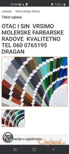 Tekst oglasa: <p>,,OTAC I SIN ,,VRSIMO MOLERSKE FARBARSKE RADOVE...060 0765195.</p> |
