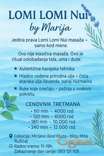 Tekst oglasa: <p><strong>🌺 Doživi Havaje u Beogradu!</strong><br /> Autentični <strong>Lomi Lomi Nui</strong> tretmani kod Marije u prijatnom prostoru.<br /> 📍Lokacija: Beograd, miran stan sa dušom<br /> 📞 063/121-3105<br /> 🕒 Radno vreme: 11–19h<br /> 💆♀️ <em>Vaše telo pamti dodir. Poklonite mu ljubav.</em></p> |