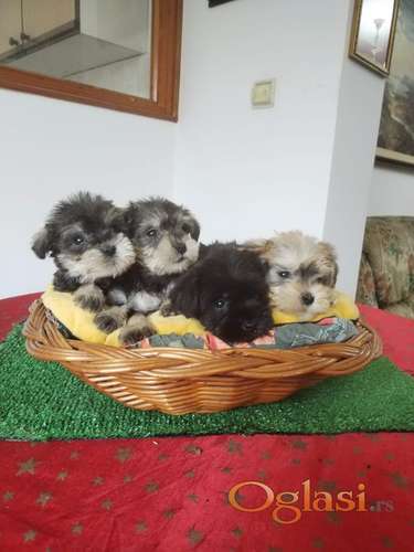 Tekst oglasa: <p></p> <p>Patuljasti šnauceri oba pola, biber-so, crni i gold&pepper, stari tri meseca.<br /> Vakcinisani, revakcinisani, redovno čišćeni od parazita.<br /> Perfektne građe, pravilnih zubala.<br /> Biber so mužjak (250), crni mužjak (250), gold&pepper ženka (450).<br /> Odgajani u kućnim uslovima uz svu potrebnu negu.<br /> Umiljati, razigrani i spremni za preuzimanje.<br /> BEZ PORUKA, SAMO POZIV.<br /> Beograd, 063290770</p> <p> </p> |