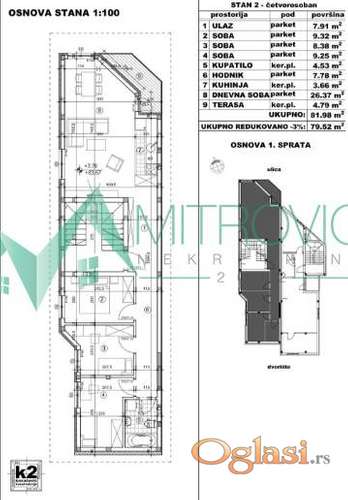 Tekst oglasa: U ponudi je četvorosoban stan u izgradnji površine 80 m², smešten na prvom spratu manje, kvalitetno projektovane stambene zgrade. Objekat je koncipiran kao mirna porodična zgrada sa ukupno 6 stanova, po tri u vertikali, što budućim vlasnicima obezbeđuje visok nivo privatnosti i prijatno okruženje za život. Stan je funkcionalnog rasporeda i gradi se uz upotrebu kvalitetnih materijala i savremenih rešenja. Predviđeno je gasno grejanje sa radijatorima, PVC stolarija sa 6 komora u antracit boji, kao i završna demit fasada koja obezbeđuje dobru termoizolaciju i dugotrajnost objekta. Postoji mogućnost kupovine parking mesta uz doplatu. Završetak radova planiran je za maj 2027. godine. Ukupna cena stana važi za keš kupce, dok je kod kupovine putem kredita ukupna cena nešto viša, što odgovara dodatku od 100 € po kvadratnom metru. U cenu su uračunati PDV i agencijska naknada od 3%. Kupovina u ranoj fazi izgradnje pruža najpovoljnije uslove, uz očekivan rast cene kako radovi budu napredovali. Za više informacija, kontakt- Dragana 069/383-1009 |