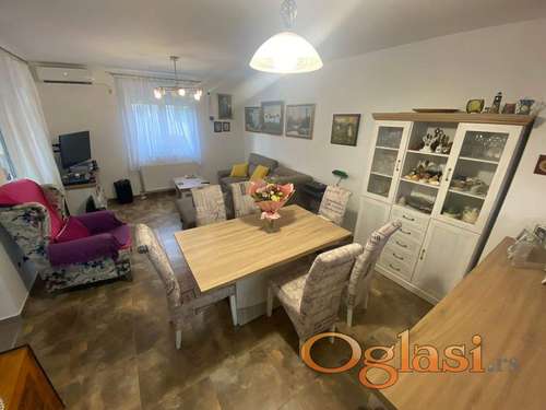Tekst oglasa: <p>Spratna kuća, novogradnja, bez ulaganja. U prizemlju ima dnevni boravak sa trpezarijom i kuhinjom, kupatilo. Na spratu su četiri spavaće sobe i kupatilo. Garaža u prednjem ulazu u dvorište. 021/425-112</p> |