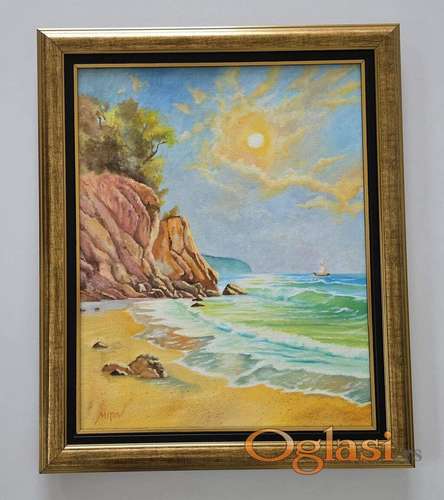 Tekst oglasa: <p>Ulje na platnu Zlatna obala mira, prelepo umetnicko delo. Slika je uramljena u jako lep, dimenzije slike sa ramom 61 x 51. Privatna kolekcija.</p> |