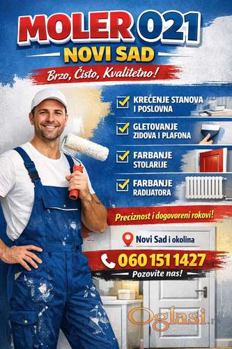 Tekst oglasa: <p>🎨 MOLER 021 – NOVI SAD<br /> Tražite pouzdanog molera koji radi brzo, čisto i kvalitetno?Na pravom ste mestu!<br /> Usluge koje nudimo:✔️ Krečenje stanova, kuća i poslovnih prostora✔️ Gletovanje zidova i plafona✔️ Farbanje stolarije (vrata, prozori)✔️ Farbanje radijatora<br /> Preciznost, urednost i dogovoreni rokovi su zagarantovani.<br /> 📍 Novi Sad i okolina📞 060 151 1427</p> |