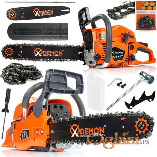Tekst oglasa: <p>Demon benzinska testera CS-65T je visoko efikasan i udoban alat koji se može koristiti u bašti, voćnjaku ili prilikom pripreme ogreva. Testera je opremljena snažnim 2-taktnim motorom. Savršena ravnoteža vratila u kombinaciji sa antivibracionim sistemom osigurava visoku efikasnost i udobnost rada. Sistem lakog pokretanja u velikoj meri olakšava pokretanje čak i hladnog motora.<br /><br /> Karakteristike:<br /><br /> Snaga motora : 2,55kw / 3.5ks<br /> Motor : 65 ccm<br /> Rezni alat : 40 cm , 325 1,5 32 zuba,<br /> Težina : 5.8 kg<br /> Gorivo : mešavina, 2,5% sa sintetičkim uljem<br /><br /> OPREMA: ( ORIGINALNO PAKOVANJE )<br /><br /> Lanac<br /> Bočica(dozer)<br /> Zub motorne testere(za kačenje pri pilanju)<br /> Ključ za svećice - šrafciger<br /> Turpija za oštrenje lanca<br /> Navlaka za mač</p> |