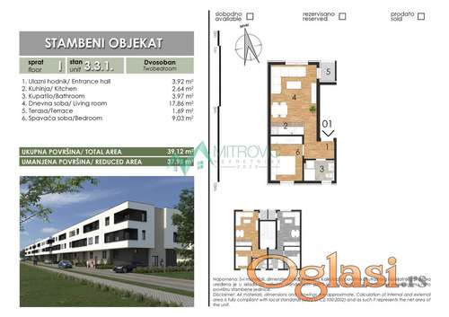 Tekst oglasa: Odličan dvosoban stan, u izgradnji, u kvalitetnom objektu ,useljivo u avgustu 2026,uredna dokumentacija,cena sa uračunatim pdv-om.Mogućnost kupovine parking mesta.U oglašenu cenu uračunata je posrednička naknada u iznosu od 3%. Kontakt za sve dodatne informacije 0693831012. |
