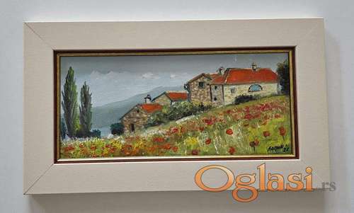 Tekst oglasa: <p>Ulje na lesonitu Pejzaz sa brda, prelepo umetnicko delo. Slika je uramljena u jako lep ram, dimenzije slike sa ramom 44 x 25. Privatna kolekcija.</p> |