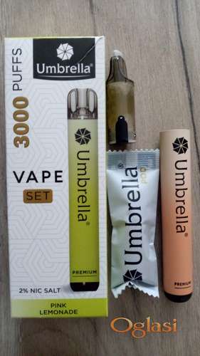 Tekst oglasa: <p>Umbrella Vape sa 2 PODs nove dopune sa aromom PINK LEMON.Puni se na punjac.<br /> Moguca zamena.</p> |