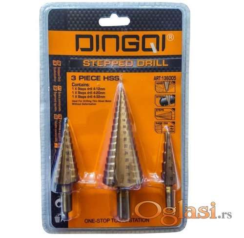 Tekst oglasa: <p>Set stepenastih burgija 4-32mm 3 kom</p> <p>Set stepenastih burgija za bušenje metala, plastike, limova. . . Dimenzije: 4-32mm (4-12 , 4-20 , 4-32).</p> <p>Dingqi art 136005</p> <p>Ukoliko zelite da porucite<br /> Posaljite poruku <br /> 1 Ime i prezime<br /> 2 Ulica i broj<br /> 3 Mesto i postanski broj<br /> 4 Broj telefona za kontakt</p> |