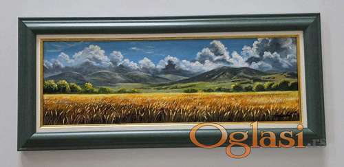 Tekst oglasa: <p>Ulje na platnu Zetva pod planinom, prelepo umetnicko delo. Slika je uramljena u jako lep, dimenzije slike sa ramom 72 x 32. Privatna kolekcija.</p> |