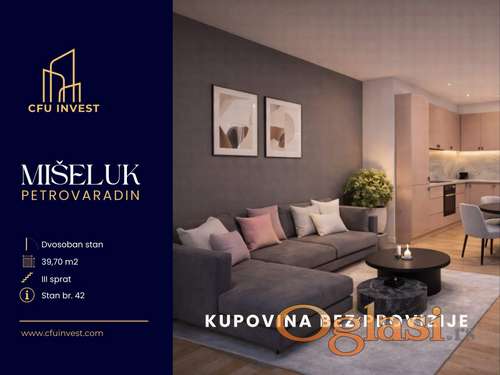 Tekst oglasa: <p style="text-align:left;">Na prodaju <strong>dvosoban stan površine 39,70 m² na 3. spratu</strong> zgrade na atraktivnoj lokaciji (Novi Sad, Mišeluk)</p> <p style="text-align:left;">Cena stana je <strong>100.441,00 EUR (sa PDV-om),</strong> <strong><u>BEZ PROVIZIJE ZA KUPCA</u>.</strong></p> <p style="text-align:left;">Mogućnost povrata PDV-a za kupce prvog stana.</p> <p style="text-align:left;">Stan se nalazi u modernom stambeno-poslovnom objektu u izgradnji (spratnosti P+4) koji je udaljen pet minuta vožnje od TC Promenada.</p> <p style="text-align:left;">Sastoji se od ulaznog hodnika, kupatila, dnevne sobe sa trpezarijom i kuhinjom, spavaće sobe i terase.</p> <p style="text-align:left;">Projekat donosi savršenu ravnotežu između urbanog komfora i privatnosti, uz najviše standarde gradnje i vrhunske materijale vodećih svetskih proizvođača. Svaka stambena jedinica projektovana je s pažnjom prema detaljima, funkcionalnosti i energetskoj efikasnosti.</p> <p style="text-align:left;">Objekat je priključen na sistem daljinskog grejanja sa protočnom toplom vodom, pri čemu svaki stan ima sopstveno merenje potrošnje (kalorimetre).</p> <p style="text-align:left;"> </p> <p style="text-align:left;">U okviru kompleksa stanarima su na raspolaganju:</p> <p style="text-align:left;">• Privatna parking mesta u dvorištu (mogućnost kupovine)</p> <p style="text-align:left;">• Garažna mesta u suterenu (mogućnost kupovine)</p> <p style="text-align:left;">• Dve biciklane za bezbedno odlaganje bicikala</p> <p style="text-align:left;"> </p> <p style="text-align:left;">Rok završetka radova: <strong>mart 2027. godine</strong></p> <p style="text-align:left;"> </p> <p style="text-align:left;"><strong>KONTAKT: 069 3 100 102, 021 3 100 102</strong></p> <p style="text-align:left;"><strong>CFU INVEST, br. u Registru posrednika 2060.</strong></p> |