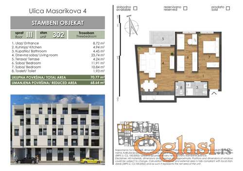 Kategorija: Stanova (Nekretnine, Prodaja) Lokacija: Rotkvarija (Srbija, Novi Sad, Novi Sad) Ulica i broj: Masarikova 2-4 Sobnost: Trosoban Kvadratura: 68 Stanje objekta: U izgradnji Grejanje: Ostalo Nivo u zgradi: 3. sprat