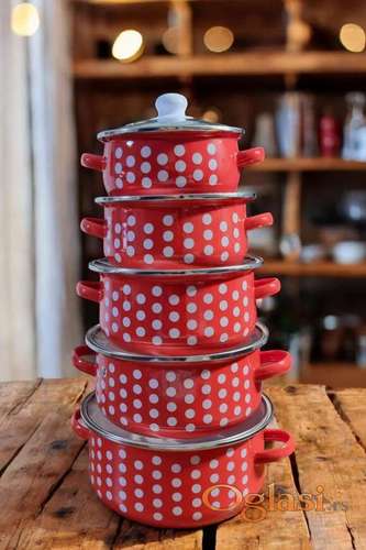 Tekst oglasa: <p>Set emajliranih šerpi zapremina od 1.2 do 4.2 litre</p> <p>Pogodne za sve podloge i indukciju</p> <p>Vatrostalni poklopci za svaku posudu</p> <p>Izdržljiv emajlirani premaz – Otporan na visoke temperature, ne rđa, ne menja ukus hrane i bezbedan za zdravlje.<br /> 5 različitih veličina – Pogodne za sve kulinarske potrebe – od manjih obroka do kuvanja za celu porodicu!<br /> Kompatibilne sa svim šporetima – Indukcija, plin, struja, klasični šporet – ravnomerno kuvaju bez zagorevanja.<br /> Jednostavno održavanje – Emajlirana površina sprečava lepljenje hrane i lako se pere ručno ili u mašini za sudove.<br /> Elegantne i praktične – Moderan dizajn, otporne na habanje, sa čvrstim ručkama za sigurno rukovanje.<br /><br /> Dimenzije šerpi u setu:<br /> Ø 24 cm / 4 L<br /> Ø 22 cm / 3.5 L<br /> Ø 20 cm / 2.5 L<br /> Ø 18 cm / 1.5 L<br /> Ø 16 cm / 1 L</p> |