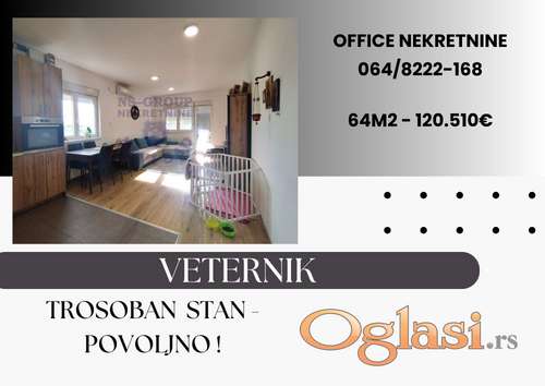 Kategorija: Stanova (Nekretnine, Prodaja) Lokacija: Veternik (Srbija, Novi Sad) Sobnost: Trosoban Kvadratura: 64 Stanje objekta: Novogradnja Grejanje: Etažno Nivo u zgradi: 2. sprat