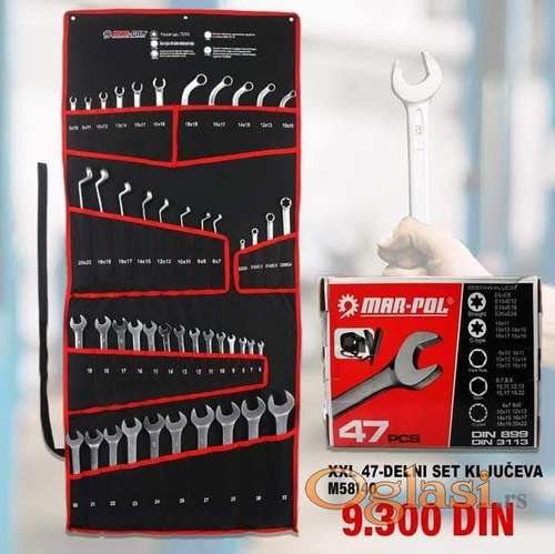 Tekst oglasa: <p>Set ključeva od 47 komada Izrađeni su od veoma izdržljivog hrom-vanadijum CRV čelika, ključevi namenjeni za rad u radionicama, vulkanizaciju kao i za kućne uradi sam poslove. Okasti deo ključa sa 12 tačaka. Glava ključa nagnuta za 15% (olakšava manevrisanje ključem). Poseban profil zuba povećava maksimalni zatezni moment za 25% (bez oštećenja matice). Zaobljeni oblici prelaza između glave ključa i drške. Imaju završnu obradu koja minimizira klizanje ključa kontaminiranog uljem. Zaštita od korozije. Set od 47 ključeva je upakovan u praktičnu futrolu, zahvaljujući kojoj zauzima malo prostora (futrola na čičak). Rupe u gornjim uglovima kućišta omogućavaju vam da okačite ključeve na zid. Set uključuje najpopularnije veličine ključeva.</p> <p>Veličine:</p> <p>8x10 / 9x11 / 10x12 / 13x14 / 15x17 / 16x18 /</p> <p>(prvi red od gore na slici - levo)</p> <p>10x11 / 12x13 / 14x15 / 16x17 / 18x19 /</p> <p>(prvi red desno)</p> <p>6x7 / 8x9 / 10x11 / 12x13 / 14x15 / 16x17 / 18x19 / 20x22 / (drugi red - levo)</p> <p>E6xE8 / E10xE12 / E14xE18 / E20xE24 /</p> <p>(drugi red - desno)</p> <p>6 / 7 / 8 / 9 / 10 / 11 / 12 / 13 / 14 / 15 / 16 / 17 / 18 / 19 mm</p> <p>(treći red)</p> <p>20 / 21 / 22 / 23 / 24 / 26 / 27 / 28 / 30 / 32 mm</p> <p>(četvrti red)</p> |