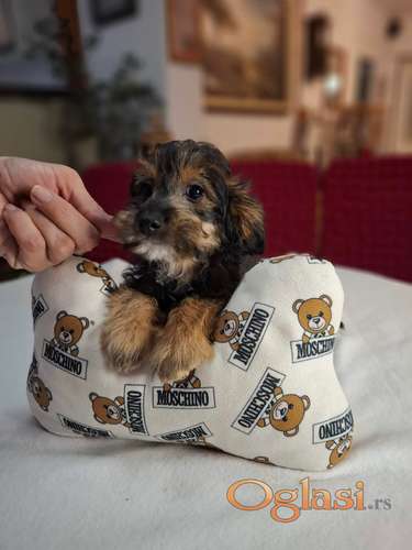 Tekst oglasa: <p>Jorki terijer i čivava, mužjak rođen 26.10.2025.<br /> Primio sve tri vakcine, redovno čišćen od parazita.<br /> Jako lepih šara, pravilne sitne građe.<br /> Majka mini jorki terijer, otac mini čivava, u vlasništvu prodavca.<br /> Jako vesele naravi, socijalizovan sa drugim psima.<br /> Gaje se u kući, uz svu potrebnu negu.<br /> Uz štene dobijate zdravstvenu potvrdu o vakcinaciji i čišćenju,<br /> i opširno otkucano uputstvo o svemu što Vam je neophodno za odgajanje psa.<br /> Registrovana odgajivačnica FCI/KSS-7156.<br /> BEZ PORUKA, SAMO POZIV.<br /> Beograd, 063290770<br /> </p> |