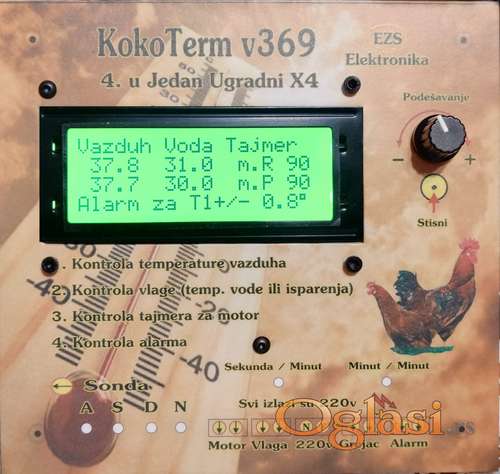 Tekst oglasa: <p><br /> ⭐️⭐️⭐️⭐️ ⭐️ KokoTerm Pro v369 ugradni x4</p> <p>⭐️⭐️⭐️ Specijalno zasticene sonde za vlagu<br /> U plasticnom kucistu i Metalnom kucistu. </p> <p>Svi uredjaji su moji lični projekti.<br /> Pogledajte sve moje oglase.</p> <p>⭐️ 3. SONDE.<br /> ⭐️ PRECIZNOST.<br /> ⭐️ KVALITET.<br /> ⭐️ TRAJNOST.<br /> ⭐️ SIGURNOST.<br /> BAŽDARENE SONDE ZA TEMPERATURU</p> <p>4u1 - Termoregulator, Vlagoregulator, Tajmer, Alarm.<br /> Automatski digitalni uredjaj.<br /> Specijalno projektovan za samogradnju i za ostale korisnike.</p> <p>- EKRAN SA 4 REDA SA SVIM ISPISOM<br /> - POSEDUJE TRI SONDE ! ! -<br /> DOPLATA ZA METALNO KUCISTE SONDE 3.5 EVRA</p> <p>Uredjaji mogu imati ove tajmere:<br /> 1. Sekunda / Minut (sekude radi / minute pauza)<br /> 2. Minut / Minut (minute radi / minuti pauza)</p> <p>Opis:<br /> Četiri u jedan sa tri sonde.<br /> Kontrola i Upravljanje TEMPERATURE, VLAGE, TAJMERA i ALARMA.</p> <p>1. Upravljanje grejačem vazduha do 1.500w<br /> uz doplatu 3kw, 4kw, 5kw. . .<br /> 2. Upravljanje vlagom (ventilator, grejač vode ili paro isparivač) do 600w<br /> 3. Kontrola i upravljanje okretanjem police za jaja (tejmer) do 300w<br /> 4. Upravljanje alarmom do 300w<br /> 5. Podesavanje temperature, korak 0,1 stepen.<br /> 6. Podesavanje vlage, korak 1%.<br /> 7. Podesavanje tajmera, korak 1,0 minut ili 1 sekunde.<br /> 8. Podešavanje alarma +-, korak 0,1 stepen.<br /> 9. Ispis na ekranu svih podešavanje i pamti sve parametre</p> |