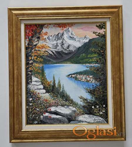 Tekst oglasa: <p>Ulje na platnu Jesen na planinskom jezeru, prelepo umetnicko delo. Slika je uramljena u jako lep ram, dimenzije slike sa ramom 66 x 56. Privatna kolekcija.</p> |
