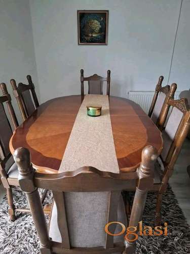 Tekst oglasa: <p>Trpezarijski set – puno drvo, očuvano, rasklopiv sto + 6 stolica<br /> Prodajem trpezarijski sto od punog drveta sa 6 stolica.<br /> Sto je rasklopiv, vrlo stabilan i očuvan, a stolice su presvučene pre godinu dana.<br /> Set je korišćen pažljivo i bez oštećenja.<br /> Idealno za klasičan ili rustičan enterijer.<br /> 📏 Dimenzije stola: 1 m × 1,6 m<br /> 📍 Lokacija: Smederevo<br /> 💶 Cena: 330 € (moguća korekcija)</p> |