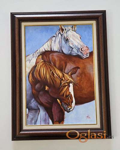 Tekst oglasa: <p>Ulje na platnu Konji u zagrljaju, prelepo umetnicko delo. Akademski slikar. Slika je uramljena u jako lep ram, dimenzije slike sa ramom 65 x 50. Privatna kolekcija.</p> |