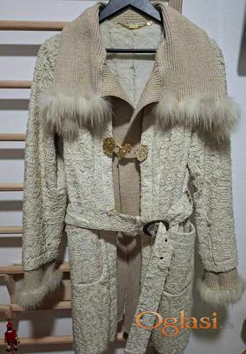 Tekst oglasa: <p>Suprema italijanski kaput, krem boje postavljen krznom, spolja vezen, kopčanje na dugmad, njihov 44 broj, naš 38.Jednom obučen. Kaiš u struku, iznutra od izvrnute kože , a spolja vez kao i kod kaputa.</p> |