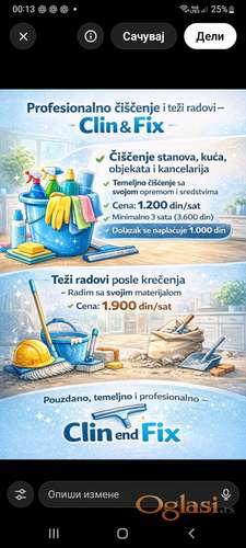 Tekst oglasa: <p>Pruzamo vam profesionalne usluge ciscenja stanova ,kuca ,kancelarija 1.200 din po satu minimum 3 sata svaki sat duze se naplacuje po istoj ceni radi se sa mojim materijalom dolazak na adresu se naplacuje 1000 din.Radovi posle krecenja se naplacuju 1900 din to su grubi radovi sa mojim materijalom . 063 7860416 Mira </p> |