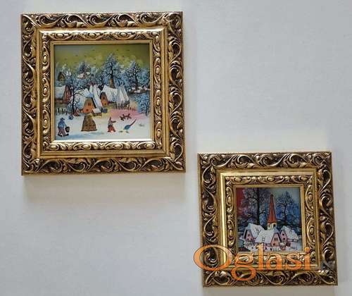Tekst oglasa: <p>Naiva, ulje na staklu Zima. Dve slike. Prelepa umetnicka dela. Slike su uramljene u jako lep ram, dimenzije slika sa ramom 25 x 25 i 20 x 20. Privatna kolekcija.</p> |