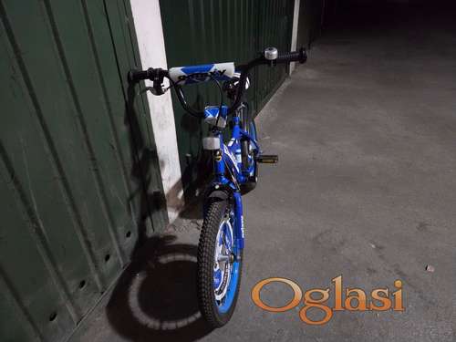 Tekst oglasa: <p>Prodajem plavi dečiji bicikl sa čeličnim ramom prečnika točka 16" i pomoćnim točkićima. Bicikli je za decu do 9 godina. Bicikl ima prednju i zadnju kontra kočnicu.</p> |