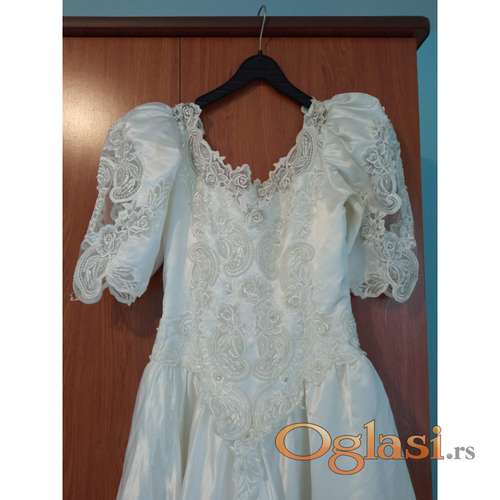 Tekst oglasa: <p> </p> <p>Vencanica za iznajmljivanje sa masnom na ledjima i pufnastim rukavima i napred sa biserima i sljokicama prelepog svilenkastog materijala. Jednom noseno.</p> |