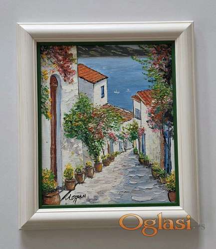 Tekst oglasa: <p>Ulje na platnu Mediteran, slika 20. Prelepo umetnicko delo. Slika je uramljena u jako lep ram, dimenzije slike sa ramom 39 x 35. Privatna kolekcija.</p> |