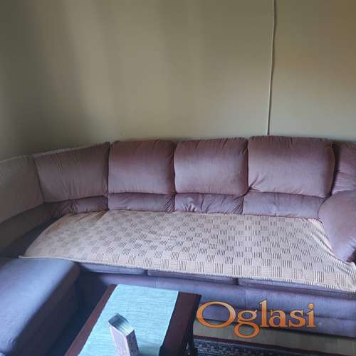 Tekst oglasa: <p>Hitno prodajem očuvanu (relativno novu) ugaonu garnituru na razvlačenje.<br /> Uži deo ima fioku dole, a duži deo se razvlači. Nema nikakvog oštećenja.<br /> Dimenzije su 2.30 x 2.70.<br /> Donji jastuci se odvajaju, dok su nasloni fiksirani.<br /> Boja ugaone garniture je rozo/lilava.</p> |