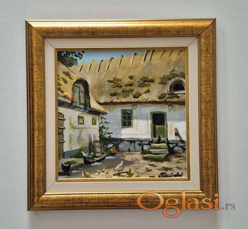 Tekst oglasa: <p>Ulje na platnu Seosko dvoriste, prelepo umetnicko delo. Slika je uramljena u jako lep ram, dimenzije slike sa ramom 40 x 40. Privatna kolekcija.</p> |