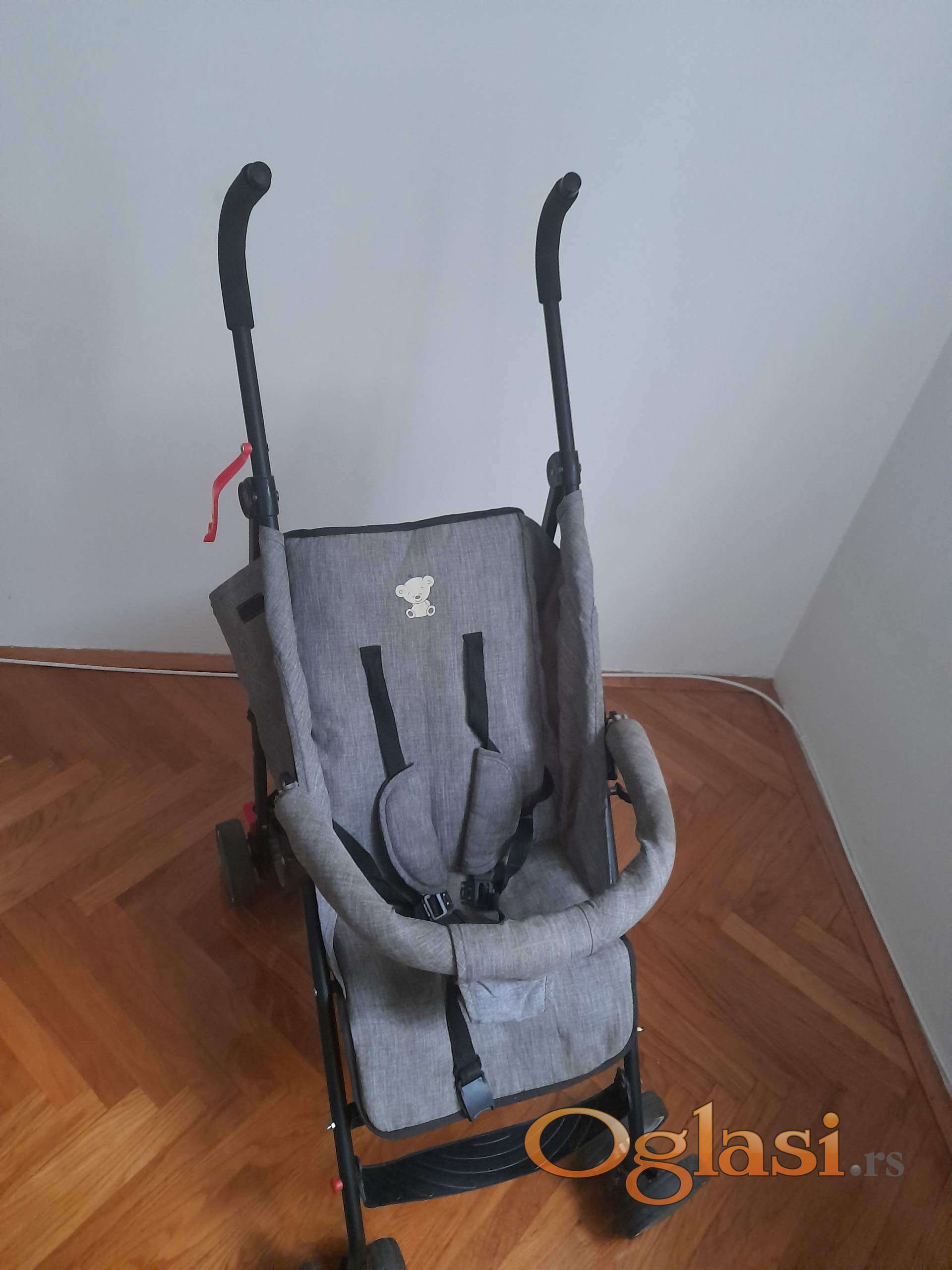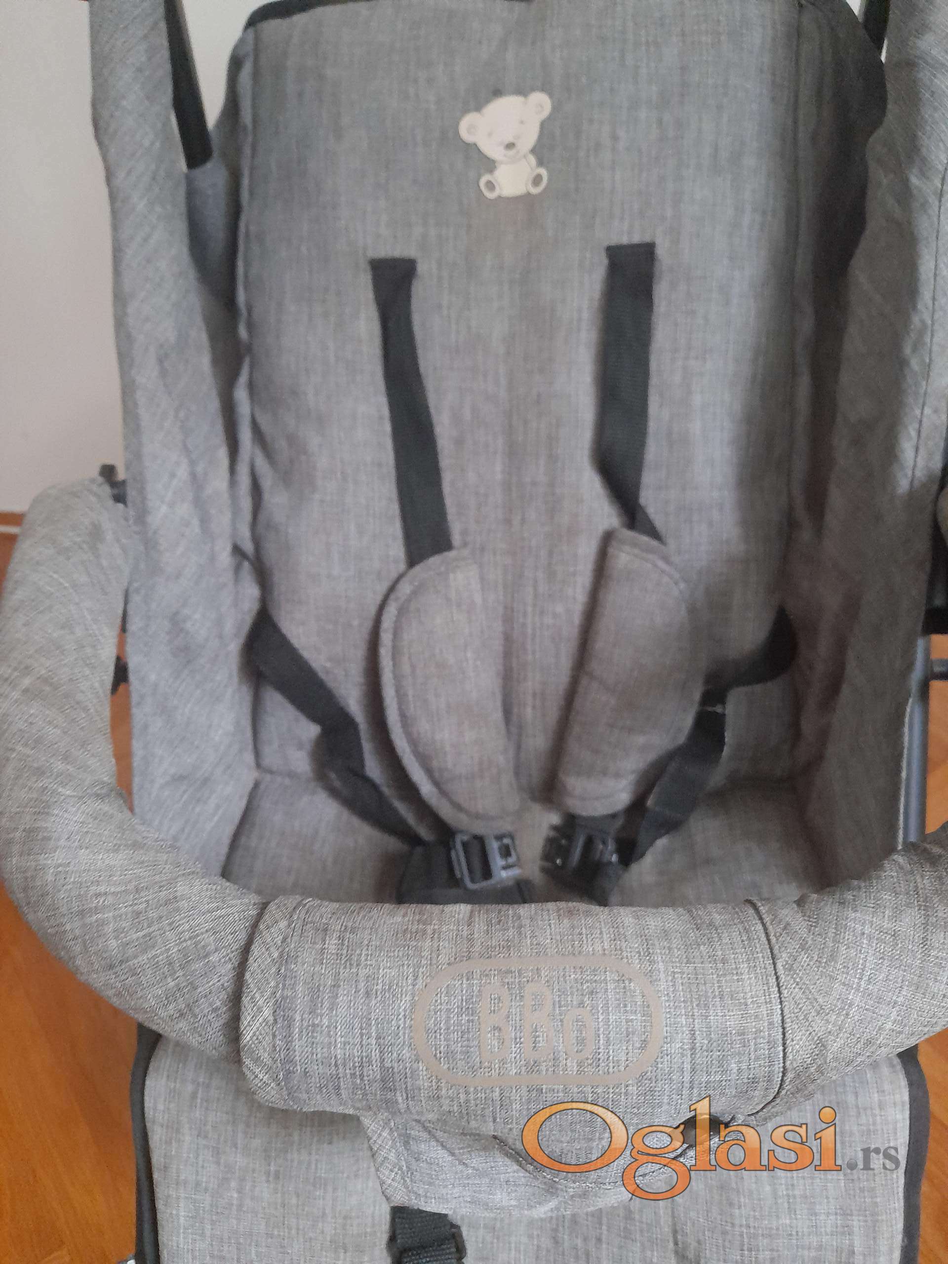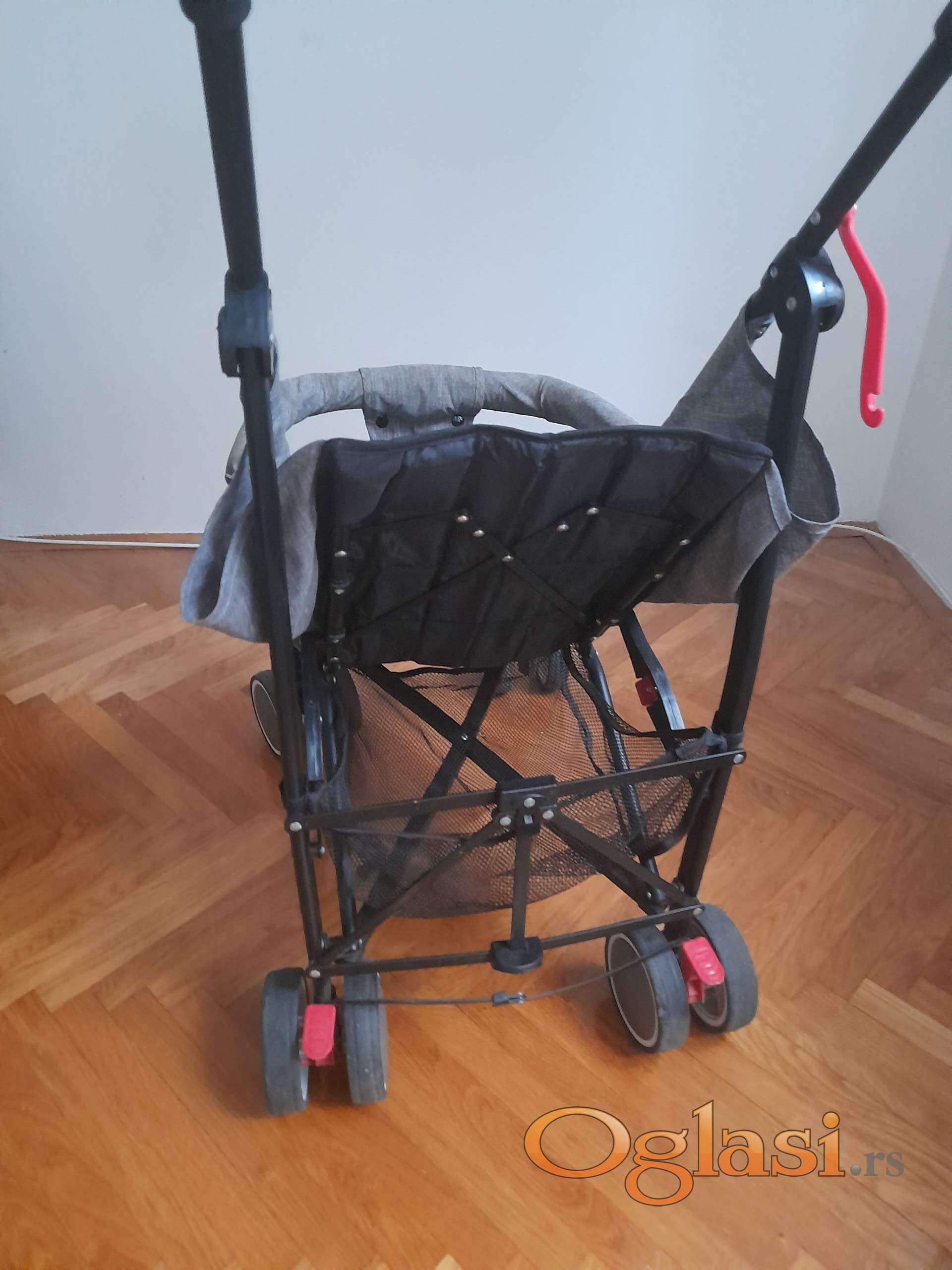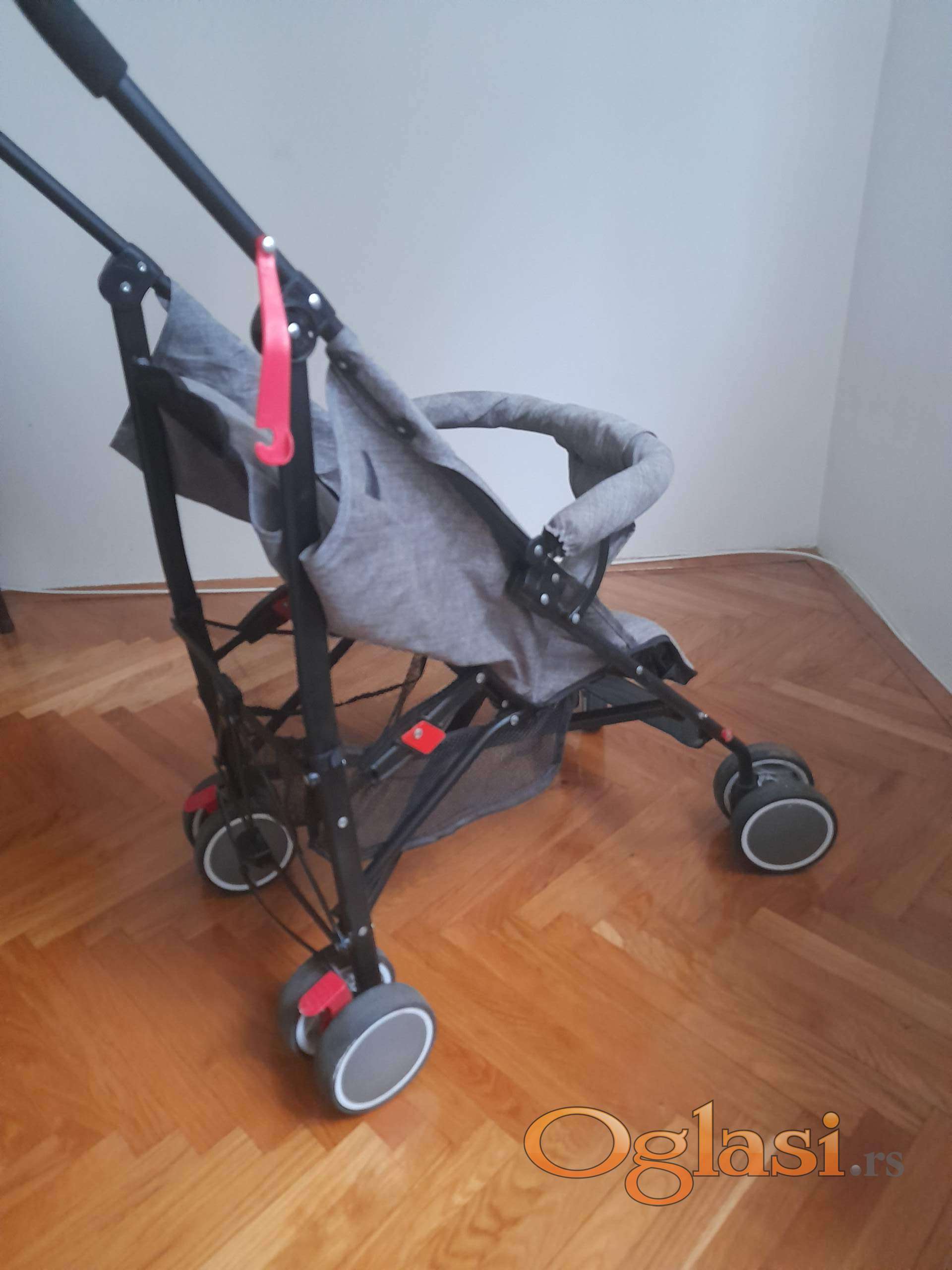 Moderna kišobran kolica do 15 kg,   podesiv naslon za leđa od ležećeg  ka sedećem. Korpu za odlaganje stvari ,vezivanje u pet tačaka. Veoma lagana. Prednji točkovi rotirajući zadnji su sa kočnicom. Kao nova slabo korišćenja.