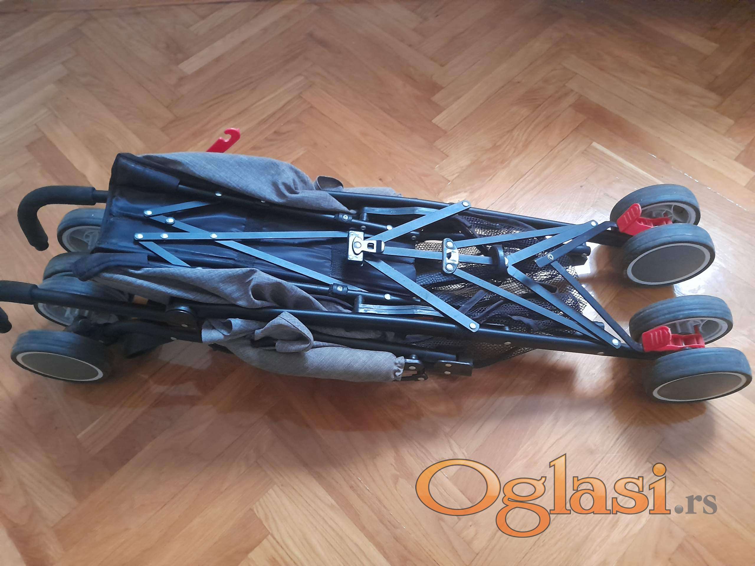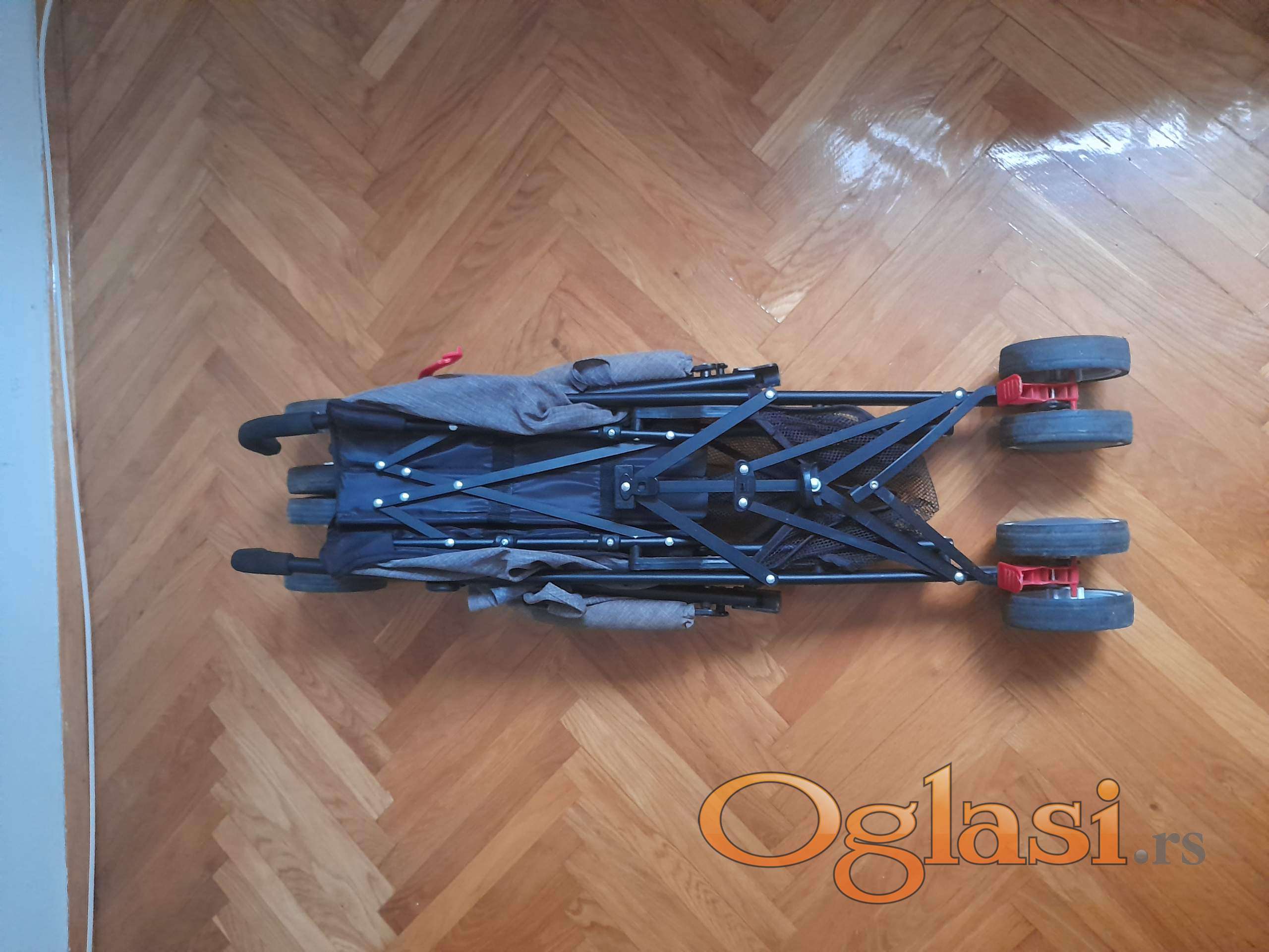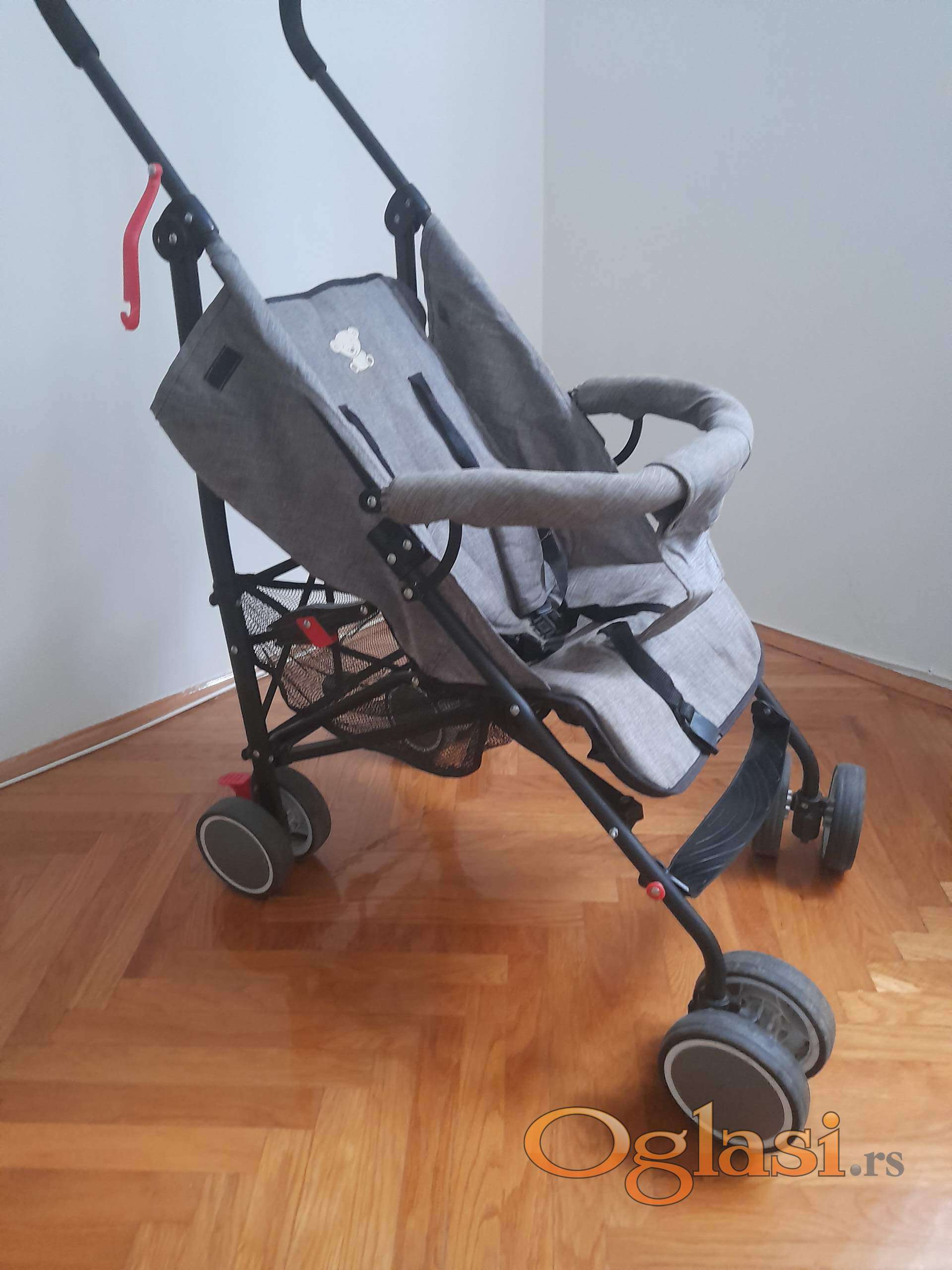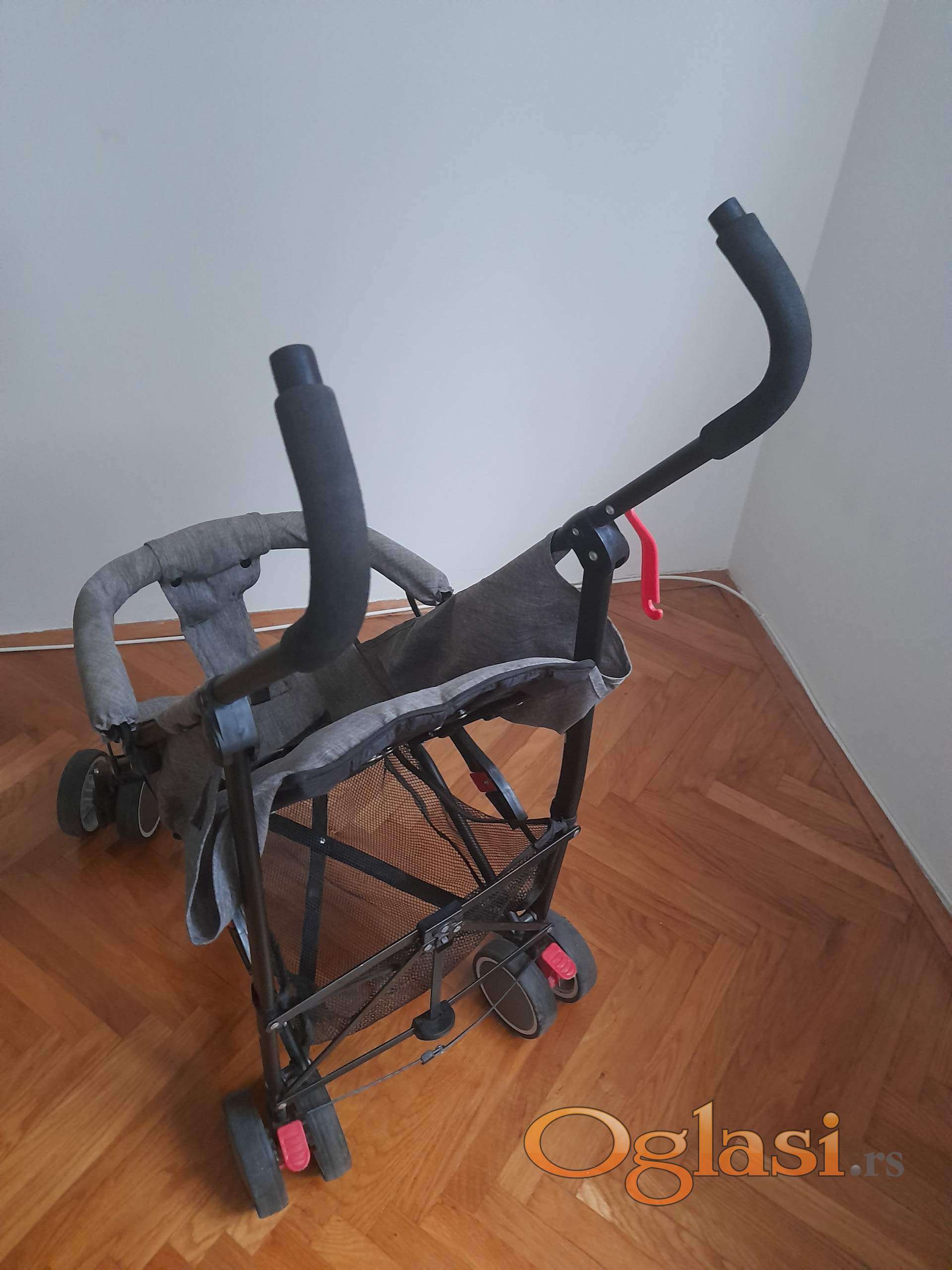 Moderna kišobran kolica do 15 kg,   podesiv naslon za leđa od ležećeg  ka sedećem. Korpu za odlaganje stvari ,vezivanje u pet tačaka. Veoma lagana. Prednji točkovi rotirajući zadnji su sa kočnicom. Kao nova slabo korišćenja.