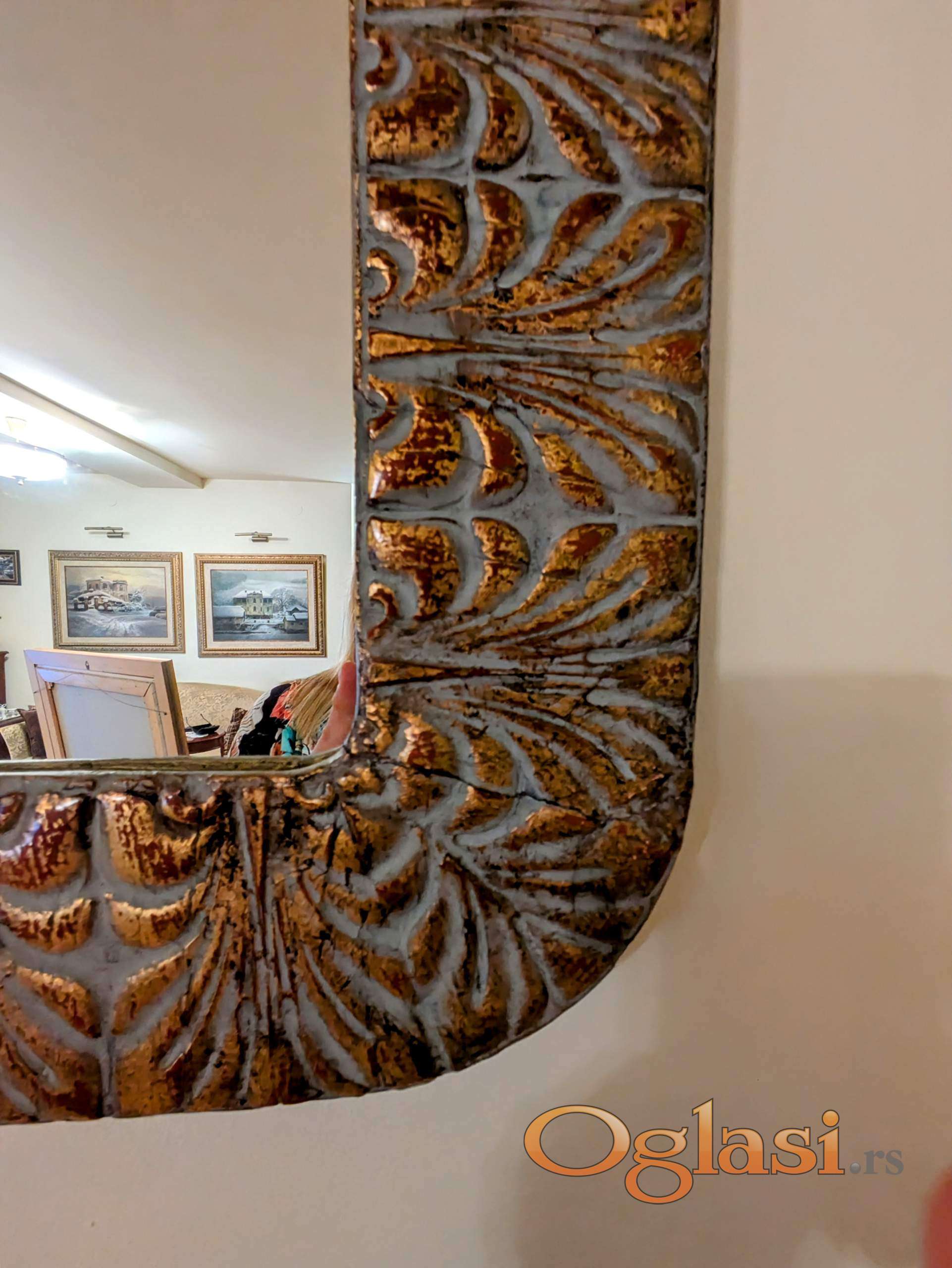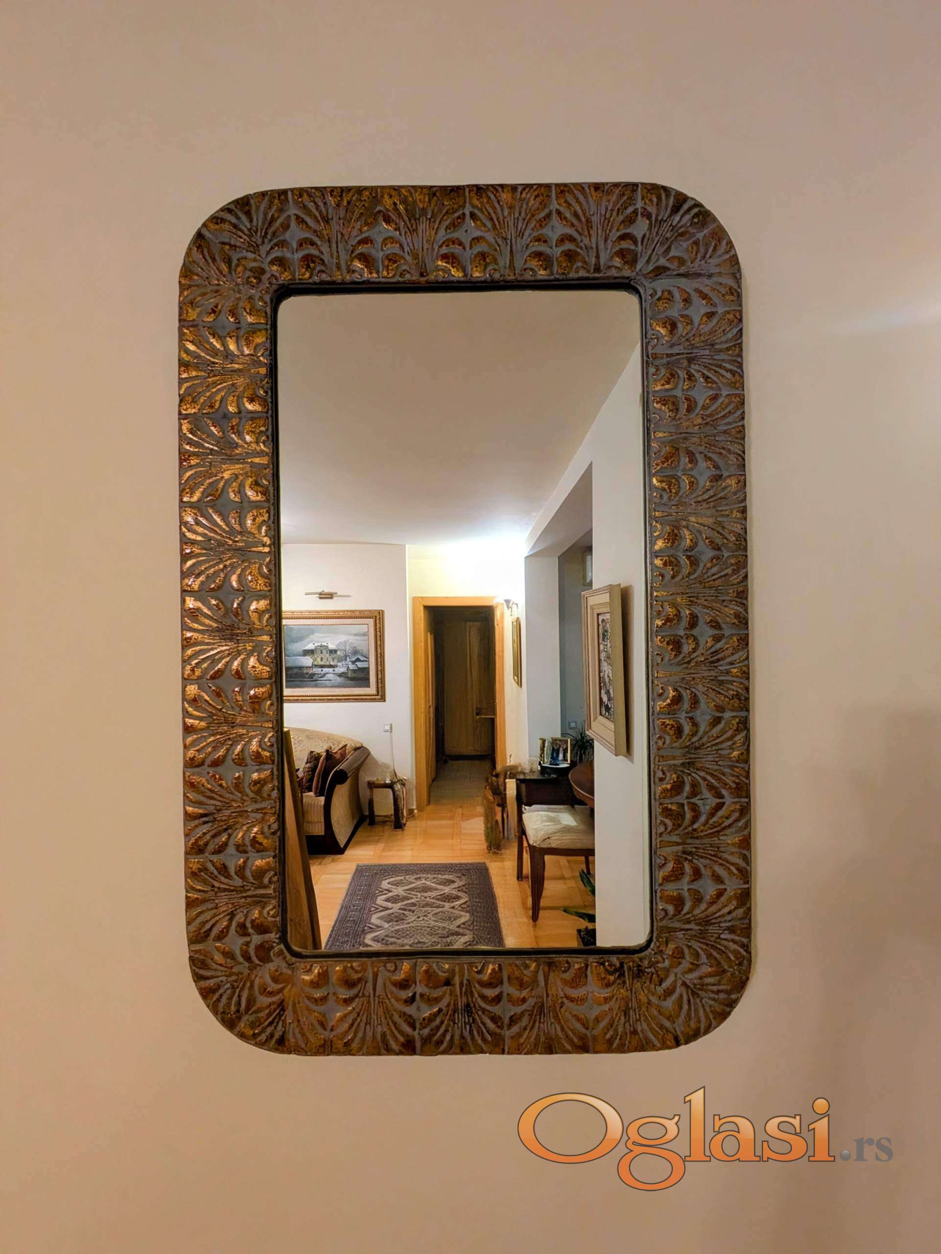 Prodajem starinsko ogledalo dimenzija 51x79 cm. Ogledalo je restaurirano, sa masivnim drvenim ramom bogato dekorisanim u zlatnim i srebrnim tonovima sa patinom. Ram ima izraženu teksturu sa vintage šarmom, idealno za klasično ili rustično uređenje enterijera. Očuvano, spremno za korišćenje. Obostrane zakačke, zadnja fotografija.