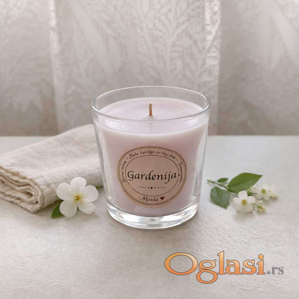 Ručno rađena mirisna sveća od prirodnog soja-kokos voska sa nežnim mirisom gardenije.