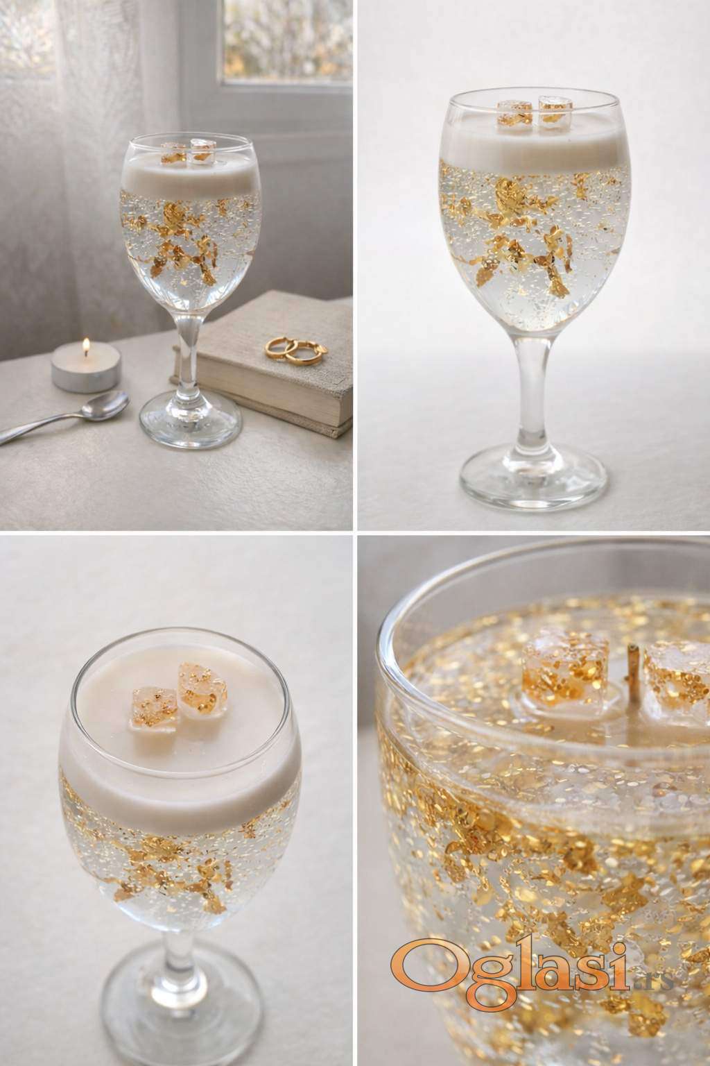 Prozirni gel vosak sa zlatnim listićima daje sveći poseban i luksuzan izgled.