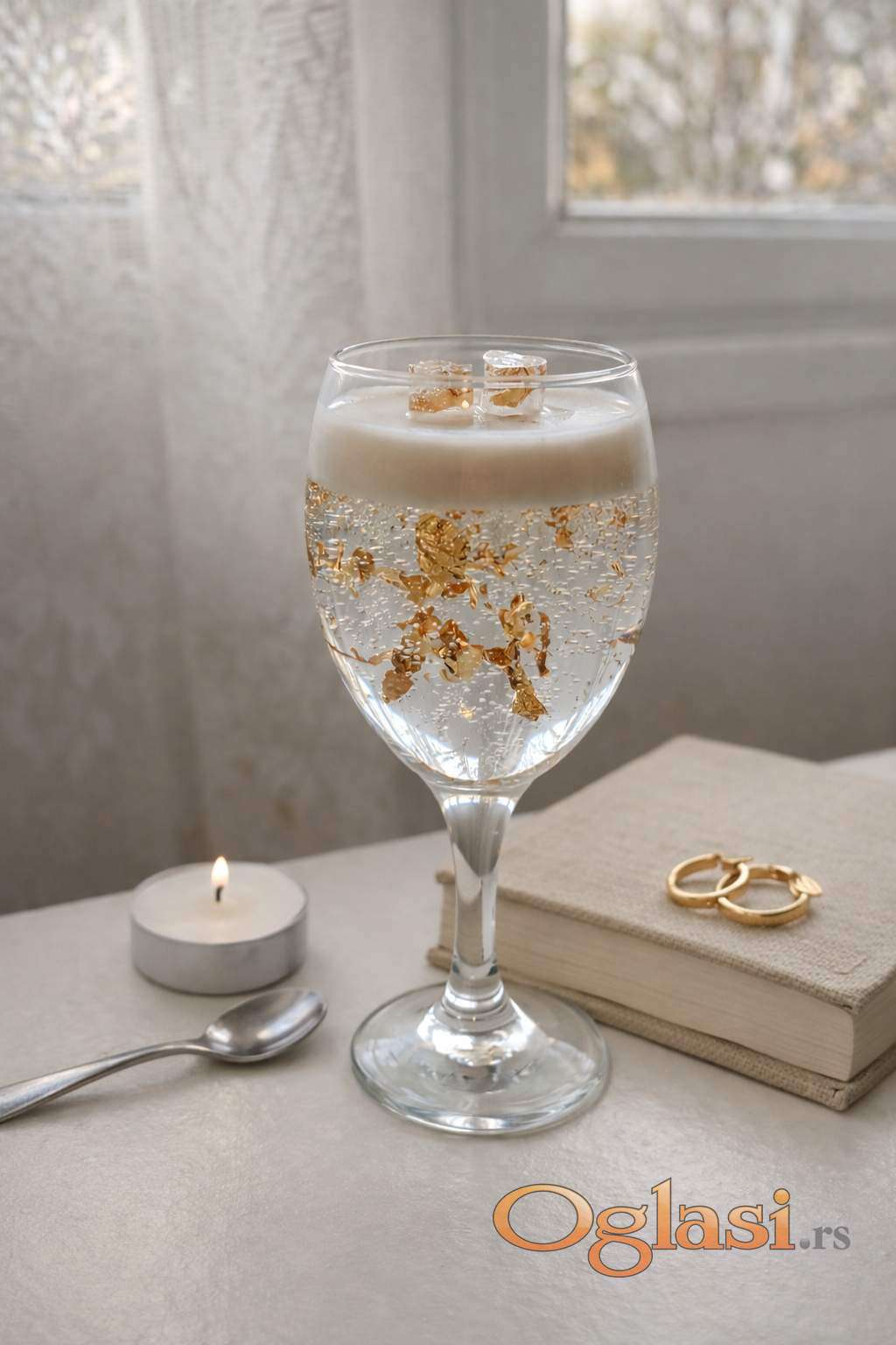 Ručno rađena dekorativna sveća od gel voska u elegantnoj čaši sa zlatnim listićima.
