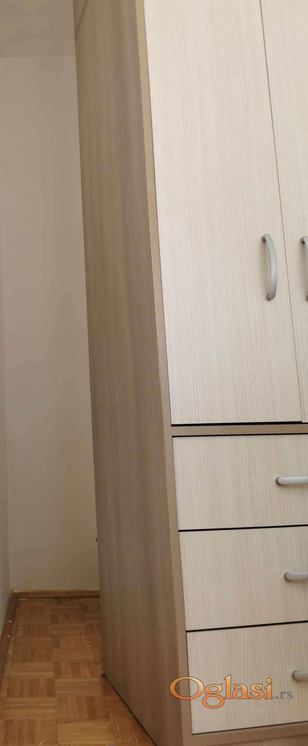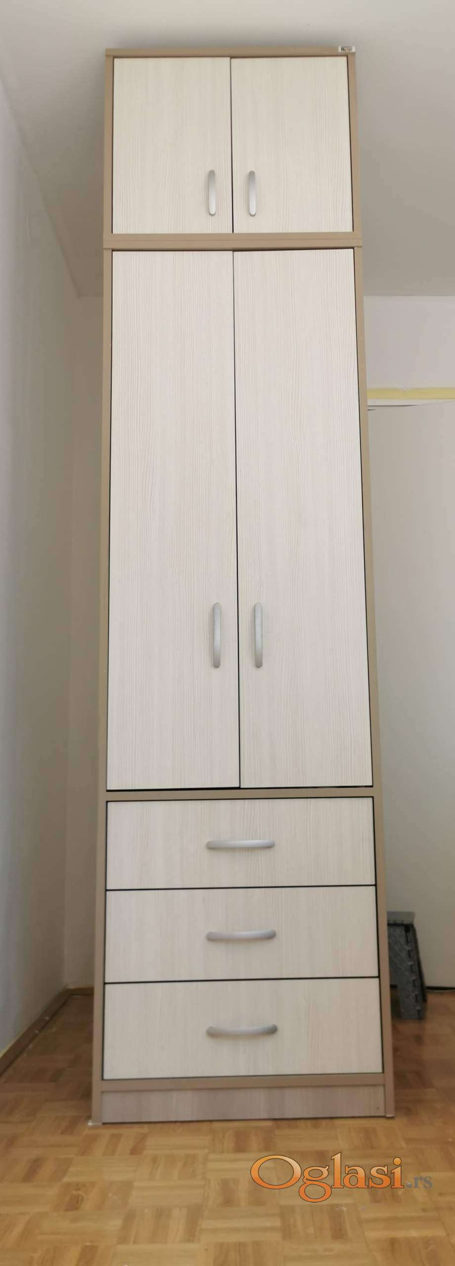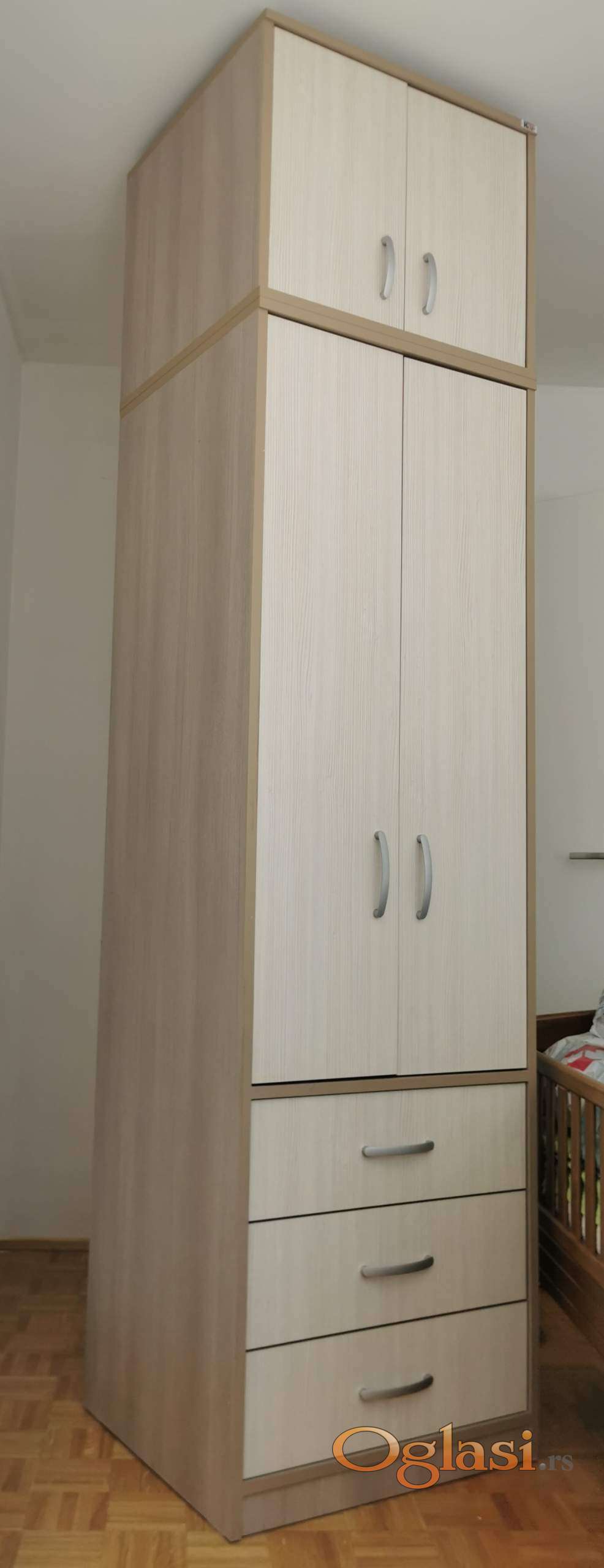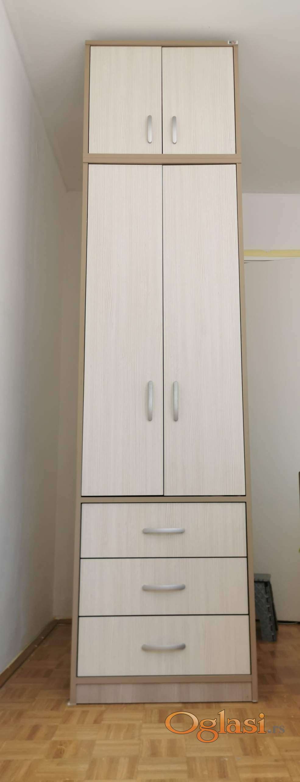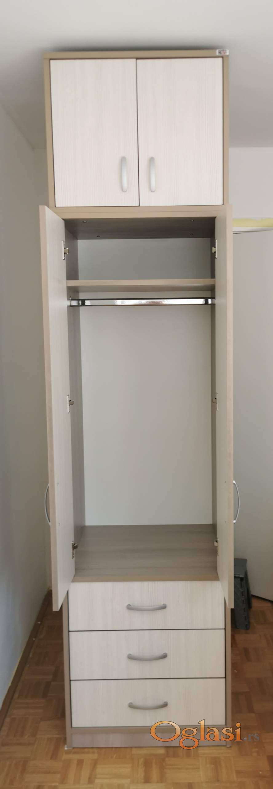 Prodajemo ormar iz dva dela, 190x60x55 i 50x60x55. Odlično očuvan, bez oštećenja, kao nov! Osnovna konstrukcija, vrata i čela fioka su izrađeni od oplemenjene troslojne iverice 18 mm. Leđa i dno fioka su izrađeni od oplemenjenog lesonita 3.2 mm. Na prodaju je jer se ne uklapa u novi raspored nameštaja u prostoriji.